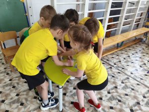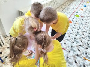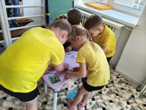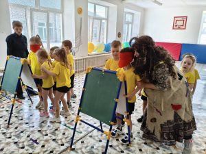 Путешественники не только соревновались: кто быстрее доскачет на лошадке, собирали с помощью варежек «снежки», переносили воду на коромыслах, бросали «копья» в цель, а также выполняли интеллектуальные задания: собирали разрезные картинки, разгадывали загадки, рисовали узоры на рукавичке с закрытыми глазами, действовали по указанию сверстников, находили выход из лабиринта, для того чтобы заработать ключик и открыть волшебный чемоданчик. Итогом было создание своей любимой книги сказок.