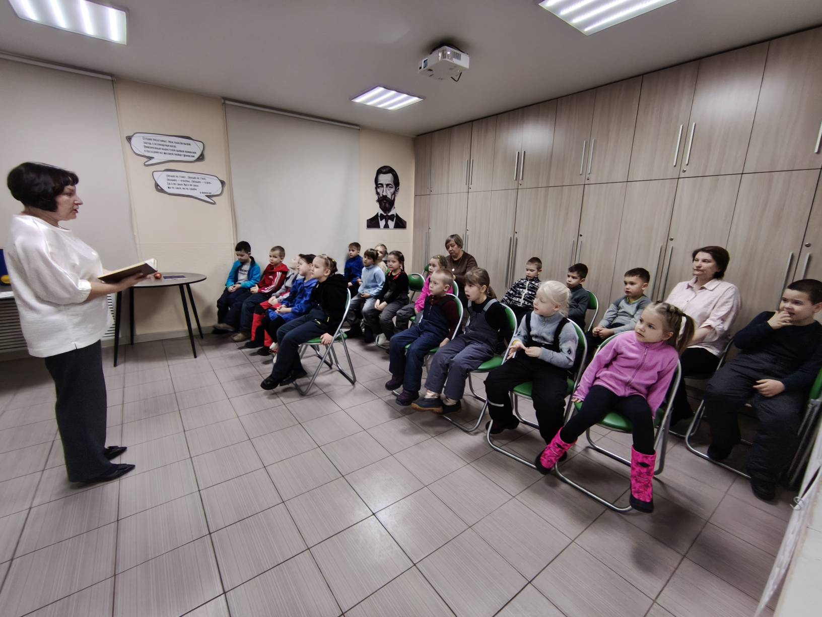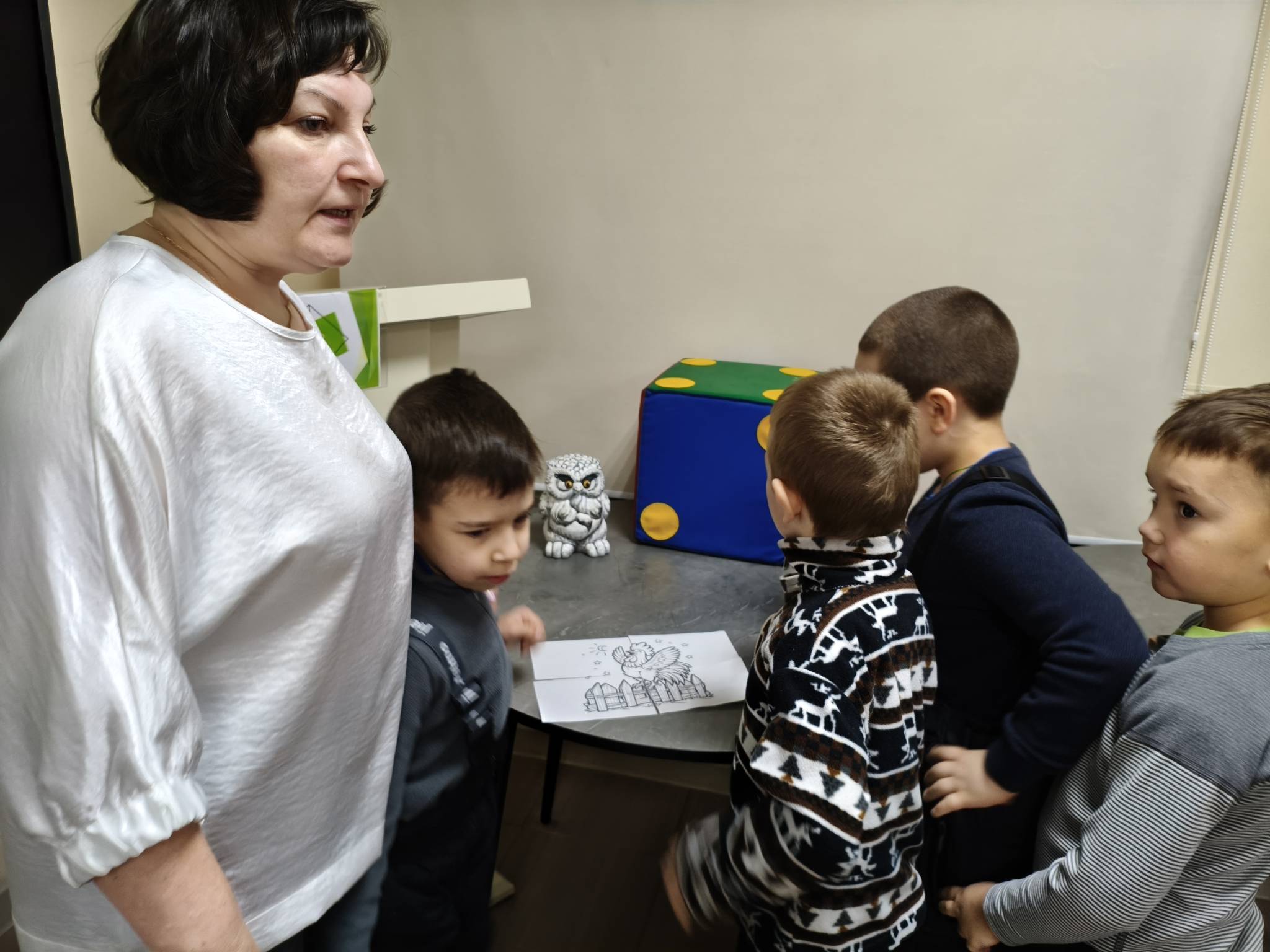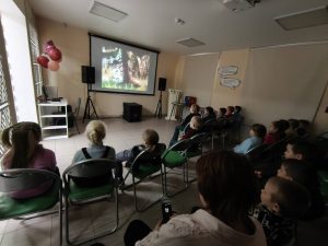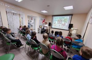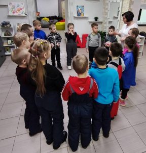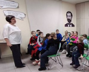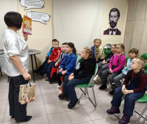 Полюхович Ольга Васильевна, заведующий Центра культурных коммуникаций, рассказала о русских народных сказках. Дети играли в квест-игру «Найди предмет из сказки», «Волшебный куб» (называли сказки, в которых есть столько героев – сколько кругов на грани кубика), «Мяч передаем и продолжаем название сказки».
