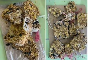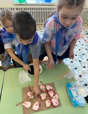 Дети заботятся о зимующих птицах, изготовили для птиц своими руками съедобные кормушки, в качестве основы для кормушки были использованы смесь крупы, семечки, яблоки, сало, хлеб, вода и мука.