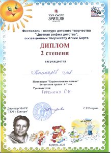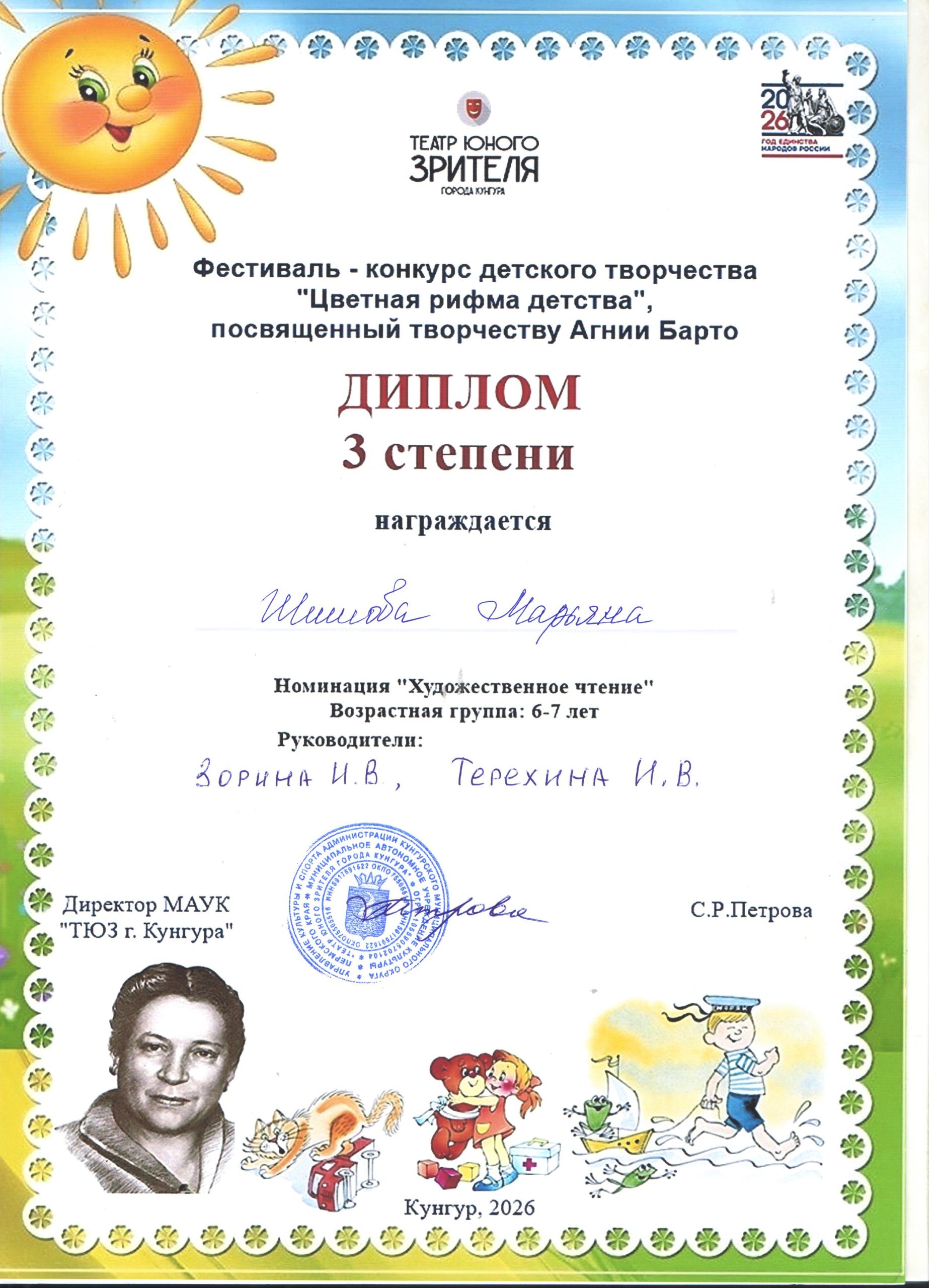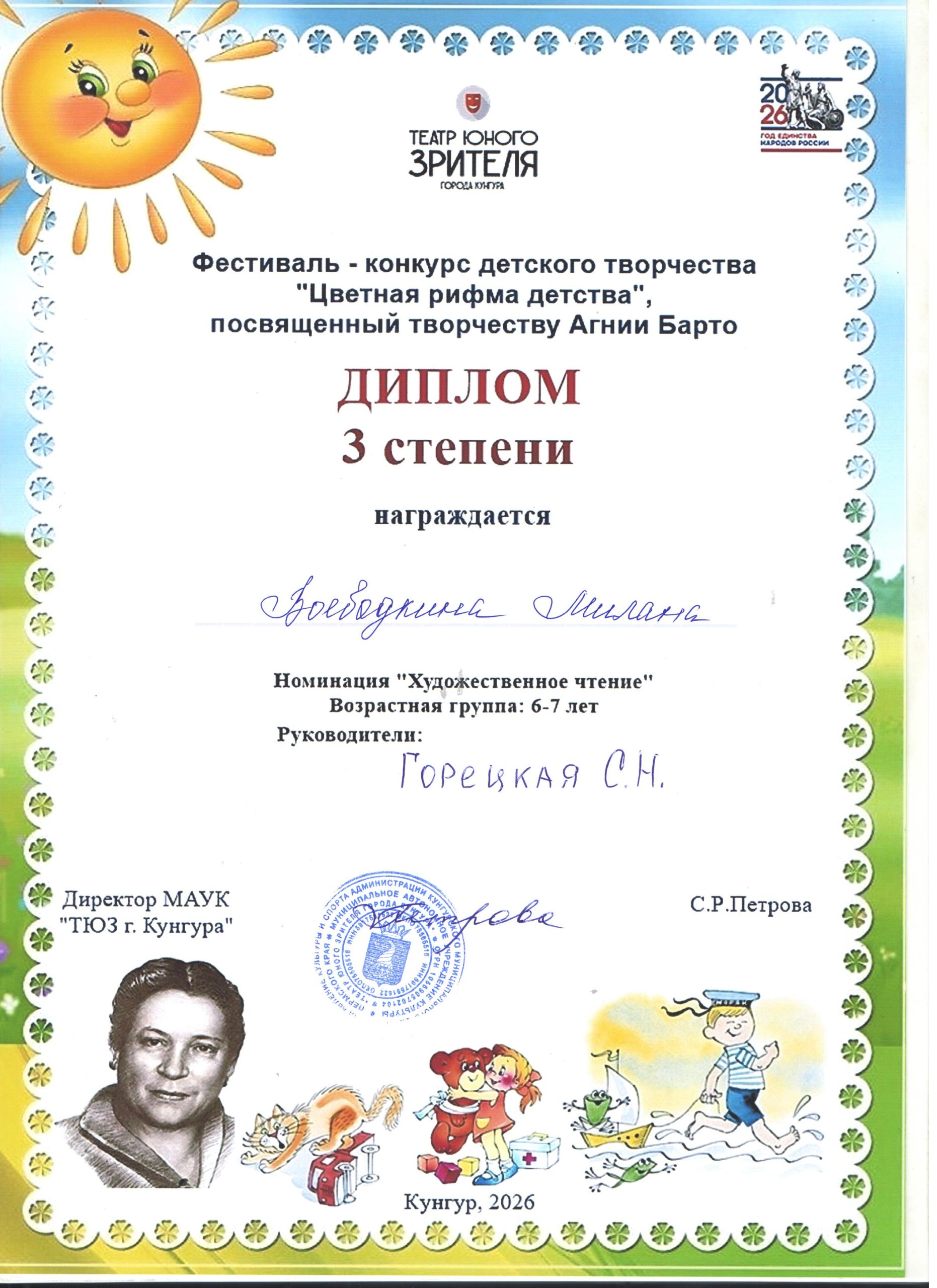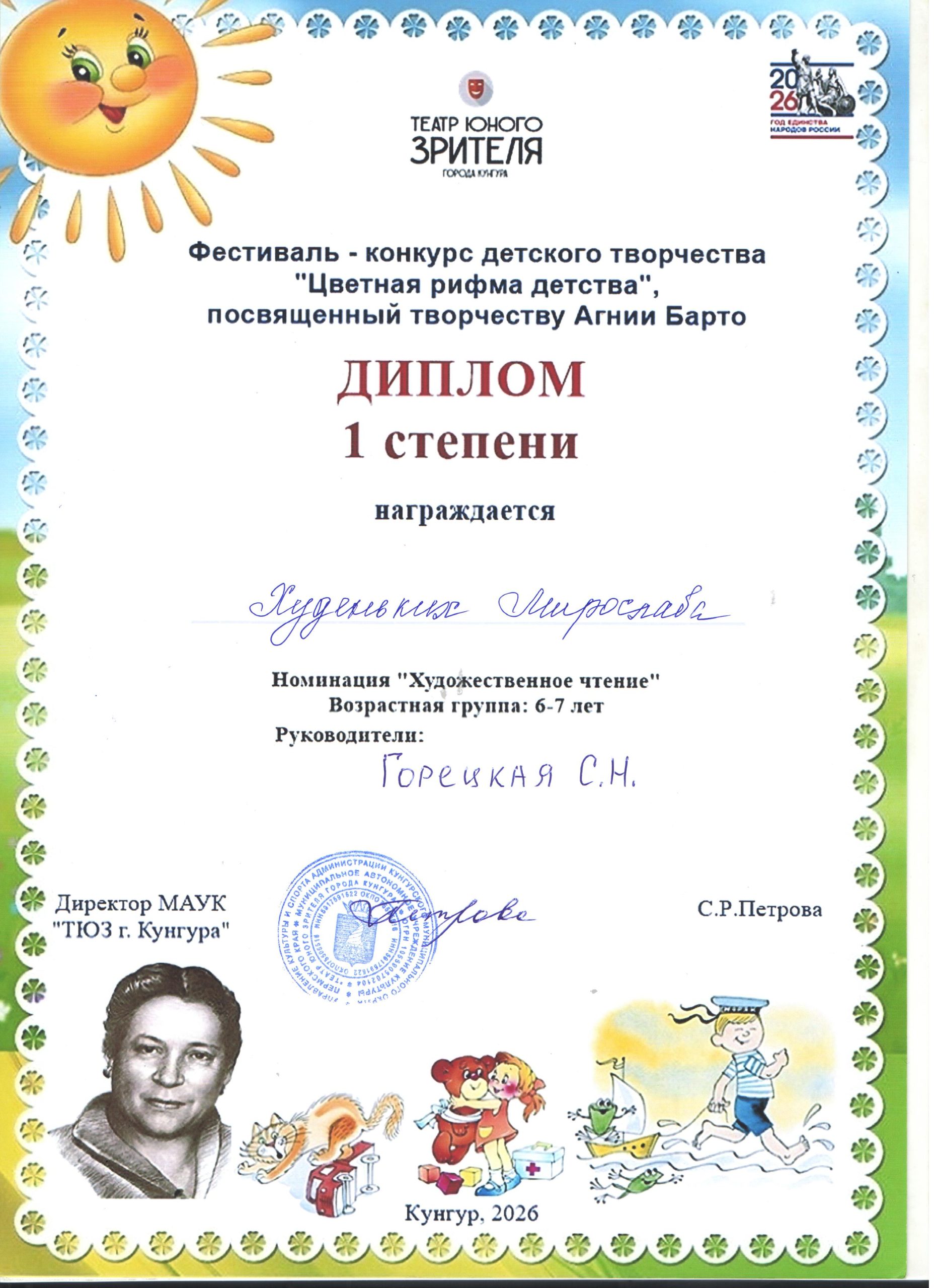 18 февраля в Театре Юного Зрителя состоялся муниципальный Фестиваль -конкурс детского творчества «Цветная рифма детства», посвященный творчеству Агнии Барто. Наши дети достойно выступили и заняли все призовые места, в своей возрастной категории.