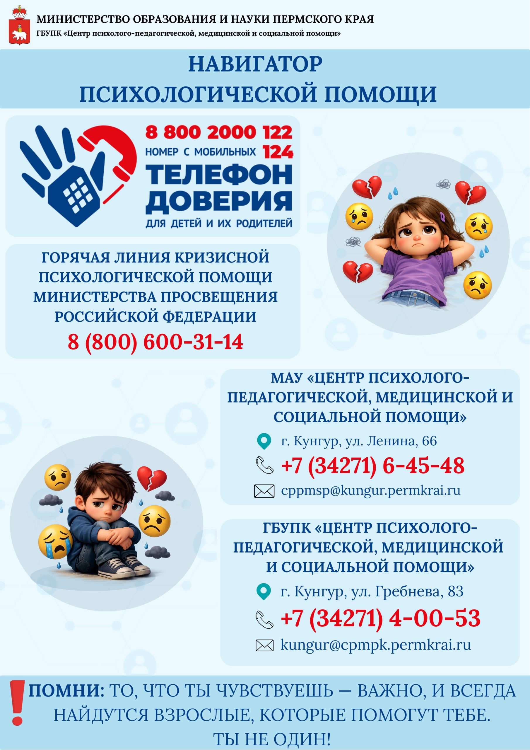 Информационные материалы с контактами центров психолого-педагогической, медицинской и социальной помощи, сведениями о работе горячих линий психологической помощи, конкретизированные