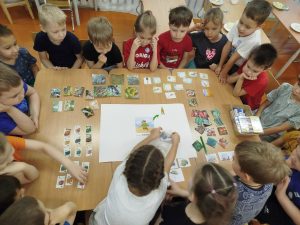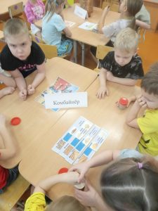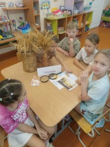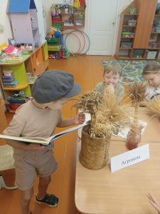 Совместная деятельность включала в себя составление интеллект –карты по профессии«Агроном» и викторину «Калейдоскоп сельскохозяйственных профессий », с целью расширения знаний детей в области сельскохозяйственных профессий, повышение престижа данной категории профессий. Дети были поделены на 3 команды, каждая выполняла свои задания. Ребята побывали в роли Агронома — рассматривали через лупу колоски ржи, овса и пшеницы . Команда «Комбайнёры» составляла разрезные картинки, в игровой форме перевозили колоски на сельскохозяйственном транспорте. Команда «Фермеров» была занята строительством фермы и уборкой овощей.