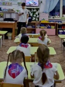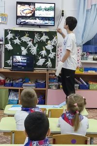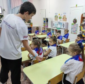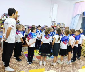 В рамках реализации проекта «Орлята — Дошколята» в гости к детям подготовительной группы № 8, корпуса № 5, пришёл ученик 8 класса МАОУ СОШ № 10, Валько Макар, который познакомил дошколят с патриотическим движением «Орлята России»